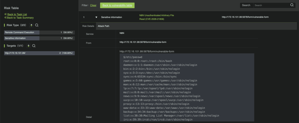 一方で、シグネチャベースのスキャナーは、レスポンスパターンに基づいてファイル読み取りの脆弱性を特定できる場合はありますが、攻撃が実際に完全な侵害へと発展するかどうかを検証することはできません。