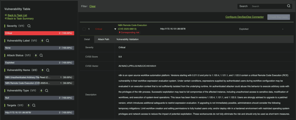 これに対し、RidgeBotのエクスプロイトベースのアプローチでは、脆弱性が存在するかどうかだけでなく、実際に展開されたコンテキストにおいてエクスプロイト可能であるかどうかを確認します。